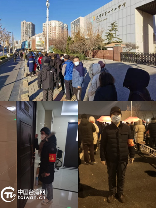 天津市委臺辦全體黨員干部以社區(qū)工作志愿者的身份投身到天津核酸“大篩”的服務(wù)保障之中。(中國臺灣網(wǎng)發(fā))