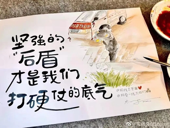 早晨醒來,簡(jiǎn)美霜為好友點(diǎn)贊后,拿起畫筆,把這張合照描繪了出來。畫面上,三位“大白”圍在一起,注視著電腦,電腦背面寫著時(shí)間,旁邊是幾個(gè)字:這些人能處,有事一起上。