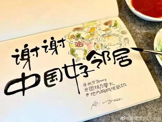 很快,簡(jiǎn)美霜?jiǎng)?chuàng)作了一副手繪:一位大叔抱來了大大的土豆,一位阿姨手里攬著一只雞,有人抱著加油瓶,還有人送來了一袋米……中間則寫著幾個(gè)字:謝謝中國(guó)好鄰居。