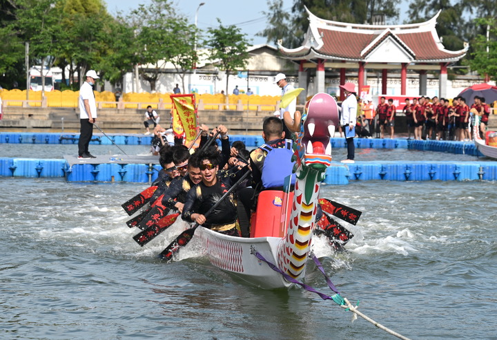 6月2日,“海芋·臺(tái)胞社工隊(duì)”在“龍騰虎躍”2022海峽兩岸龍舟賽300米直道賽的預(yù)賽中沖過(guò)終點(diǎn)。新華社記者林善傳攝