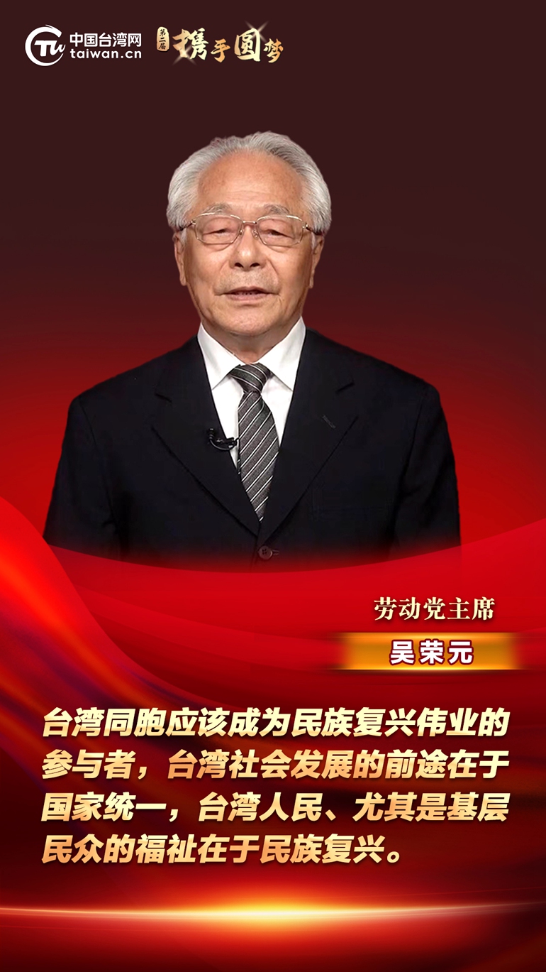 第二屆“攜手圓夢——兩岸同胞交流研討活動”7日在北京開幕。勞動黨主席吳榮元在視頻致辭時表示,臺灣同胞應該成為民族復興偉業(yè)的參與者,臺灣社會發(fā)展的前途在于國家統(tǒng)一,臺灣人民、尤其是基層民眾的福祉在于民族復興。