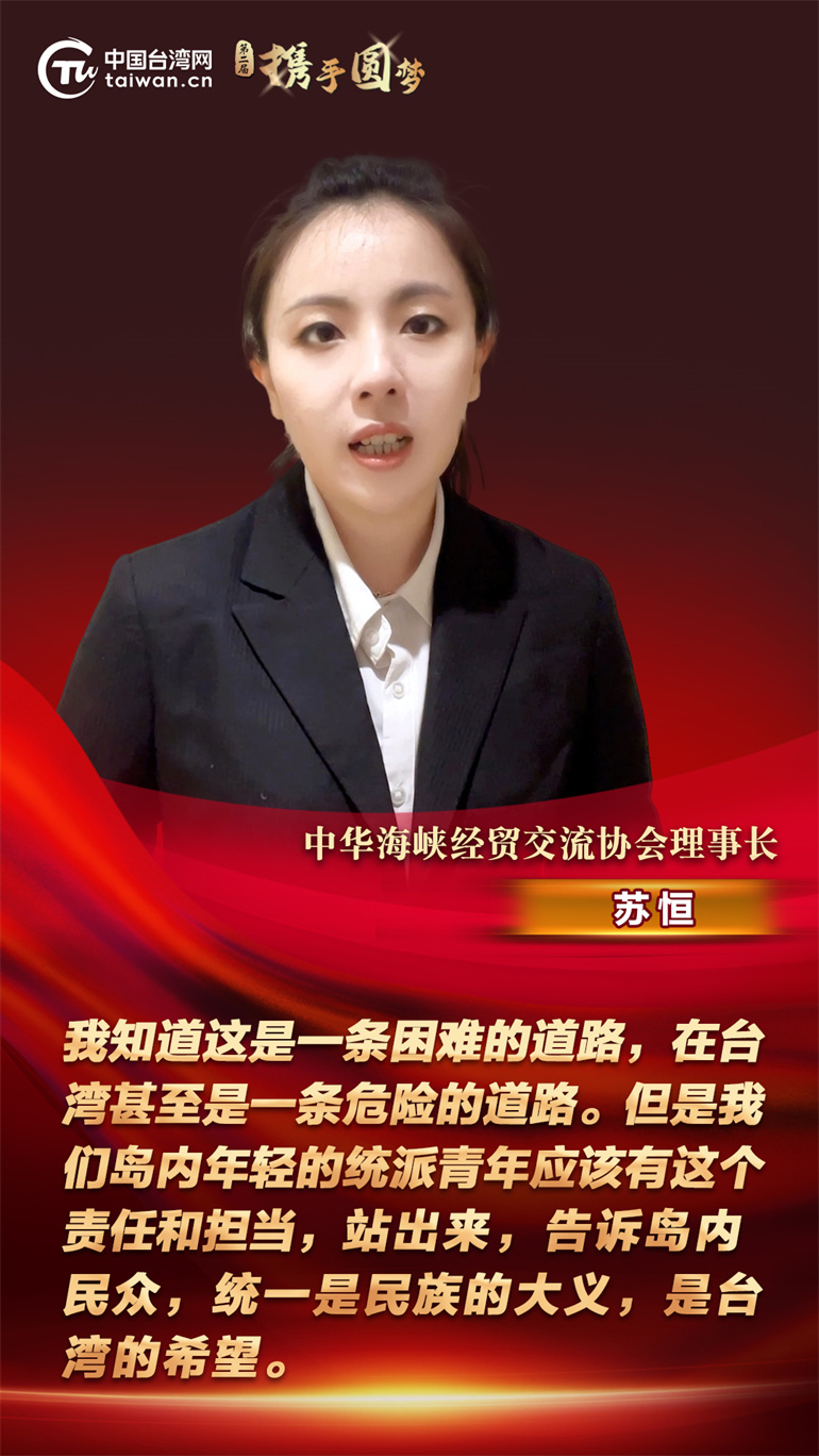 中華海峽經(jīng)貿(mào)交流協(xié)會理事長蘇恒在日前舉辦的第二屆“攜手圓夢——兩岸同胞交流研討活動”上表示,我知道這是一條困難的道路,在臺灣甚至是一條危險的道路。但是我們島內(nèi)年輕的統(tǒng)派青年應(yīng)該有這個責(zé)任和擔(dān)當(dāng),站出來,告訴島內(nèi)民眾,統(tǒng)一是民族的大義,是臺灣的希望。