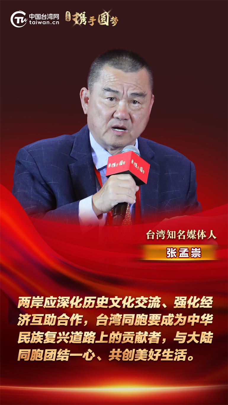 臺(tái)灣知名媒體人張孟崇在日前舉辦的第二屆“攜手圓夢(mèng)——兩岸同胞交流研討活動(dòng)”上表示,兩岸應(yīng)深化歷史文化交流、強(qiáng)化經(jīng)濟(jì)互助合作,臺(tái)灣同胞要成為中華民族復(fù)興道路上的貢獻(xiàn)者,與大陸同胞團(tuán)結(jié)一心、共創(chuàng)美好生活。