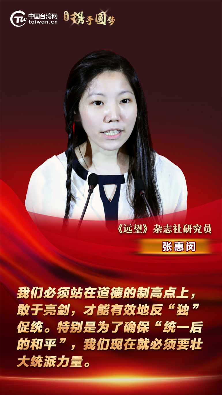 《遠(yuǎn)望》雜志社研究員張惠閔在日前舉辦的第二屆“攜手圓夢——兩岸同胞交流研討活動”上表示,我們必須站在道德的制高點上,敢于亮劍,才能有效地反“獨”促統(tǒng)。特別是為了確保“統(tǒng)一后的和平”,我們現(xiàn)在就必須要壯大統(tǒng)派力量。
