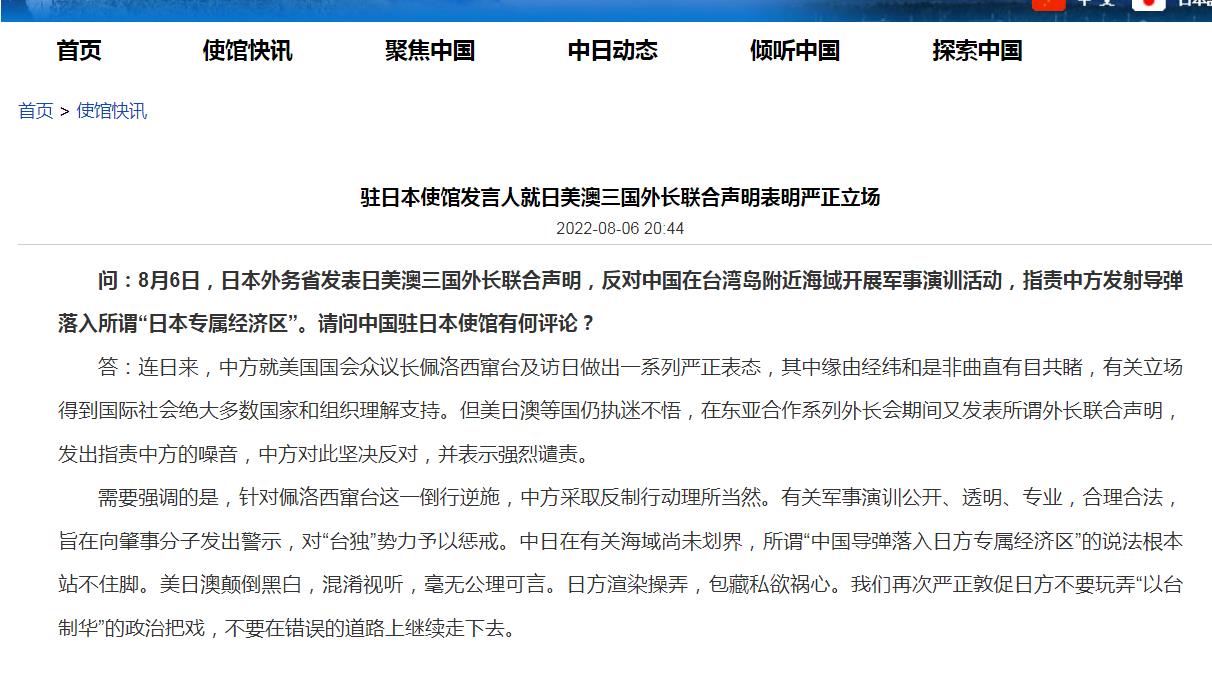 中新網(wǎng)東京8月6日電 (記者 朱晨曦)日本外務(wù)省6日發(fā)表日美澳三國外長(zhǎng)聯(lián)合聲明,反對(duì)中國在臺(tái)灣島附近海域開展軍事演訓(xùn)活動(dòng),指責(zé)中方發(fā)射導(dǎo)彈落入所謂“日本專屬經(jīng)濟(jì)區(qū)”。對(duì)此,中國駐日本使館發(fā)言人當(dāng)日表示,中方對(duì)此堅(jiān)決反對(duì),并表示強(qiáng)烈譴責(zé)。