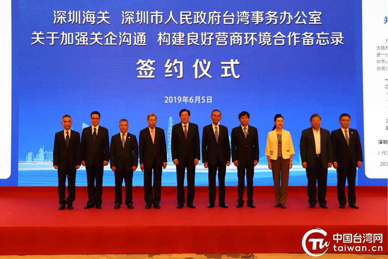 2019年6月,深圳海關(guān)與深圳臺辦簽訂《關(guān)于加強(qiáng)關(guān)企溝通 構(gòu)建良好營商環(huán)境合作備忘錄》,兩岸企業(yè)家峰會大陸方面理事長郭金龍、臺灣方面副理事長邱正雄等出席簽約儀式。(中國臺灣網(wǎng)發(fā))
