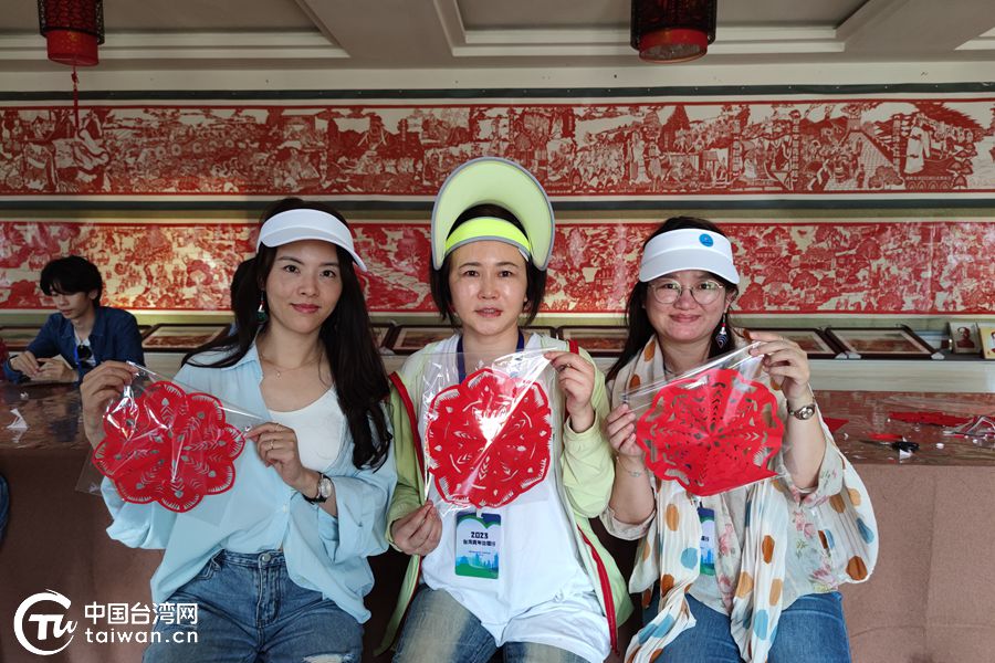 臺灣青年們整齊地坐在長桌兩旁,開始學(xué)習(xí)基礎(chǔ)剪紙工藝。手起剪刀落,趙阿姨一邊講、一邊剪,一張精致的紙花便映入眼簾。