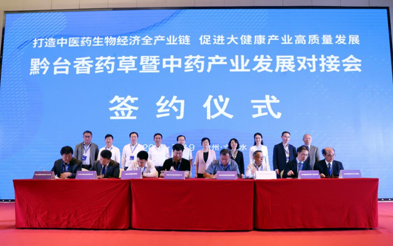 圖為7月19日舉行的“黔臺香藥草暨中藥產業(yè)發(fā)展對接會”簽約儀式現場,這是2023年“貴州·臺灣經貿交流合作懇談會”系列活動之一。