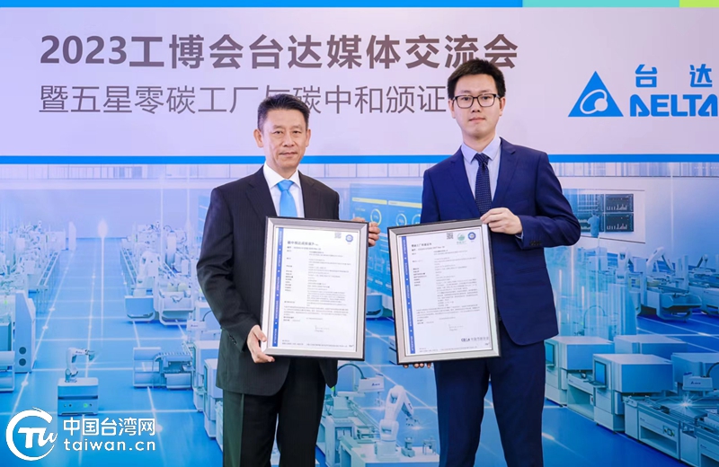 臺(tái)達(dá)吳江五廠近期獲得“五星零碳工廠”及碳中和達(dá)成認(rèn)證,認(rèn)證機(jī)構(gòu)TüV南德意志集團(tuán)代表周峰(右)向臺(tái)達(dá)首席執(zhí)行官鄭平(左)頒發(fā)證書。(中國(guó)臺(tái)灣網(wǎng) 發(fā))