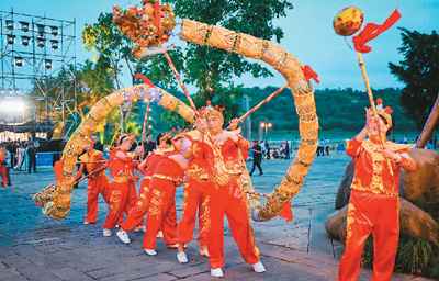在四川宜賓,演員在“三江映明月 天涯共此時(shí)”海峽兩岸中秋音樂晚會(huì)上舞草龍迎佳節(jié)。