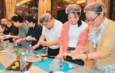 “清泉邀月明 碧荷融桃實(shí)”兩岸山東鄉(xiāng)親中秋聯(lián)誼會(huì)上,臺(tái)胞臺(tái)屬相聚一堂,體驗(yàn)月餅制作。