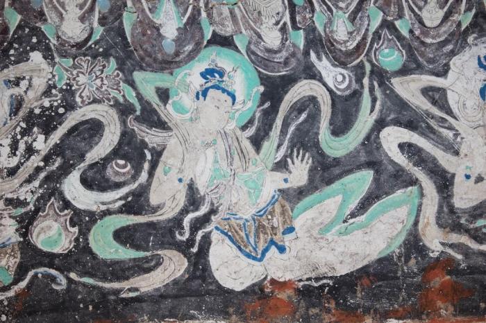 10月12日,兩岸合辦的《妙音莫高──敦煌樂舞專題展》在線上開展。圖為展覽中呈現(xiàn)的敦煌榆林窟中的飛天樂伎。敦煌研究院供圖