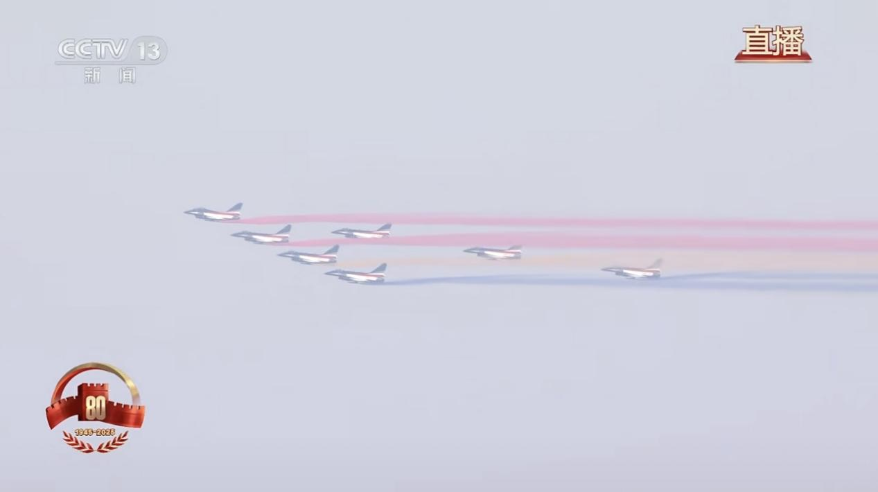 教練機(jī)梯隊(duì)接受檢閱時(shí)拉出14道彩煙,寓意中華民族14年可歌可泣的抗戰(zhàn)歷程,象征著14億多中國(guó)人民奔向強(qiáng)國(guó)復(fù)興的光明前景。(央視直播截屏)