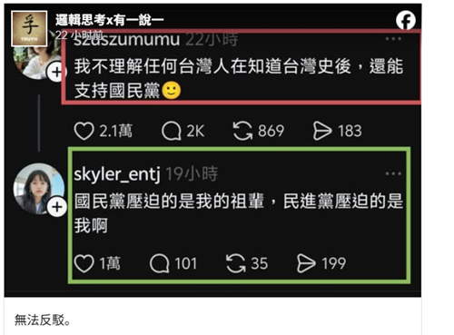 社交平臺上,有“青鳥”網(wǎng)民直呼“我不理解任何人在知道臺灣史后,還能支持國民黨?”,遭到網(wǎng)友神吐槽:“國民黨壓迫的是我的祖輩,民進黨壓迫的是我。 币l(fā)熱議。