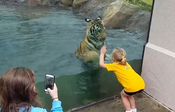 視頻中,小女孩隔著一道玻璃墻與老虎一同玩耍,還稱呼自己的新朋友為“邁克(Mike)”。厚厚的玻璃墻絲毫不能影響這對朋友間的奇妙友誼。一人一虎相互擊掌,老虎甚至還模仿小女孩玩起了“跳高高”,似乎要與她一較高下。
