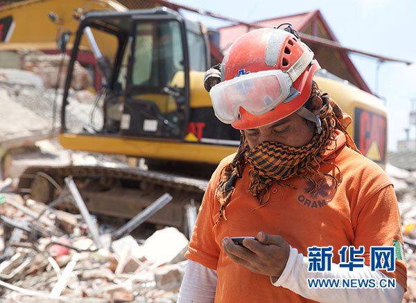 9月9日,在墨西哥瓦哈卡州胡奇坦,一名搜救人員在搜救工作間隙查看手機(jī)。根據(jù)墨西哥政府發(fā)布的最新數(shù)據(jù),截至9日晚,墨西哥地震遇難人數(shù)已上升至90人。墨西哥軍方和國(guó)防部開(kāi)始向受災(zāi)最嚴(yán)重的瓦哈卡州胡奇坦增派救援人員,為當(dāng)?shù)孛癖娞峁┤说涝P氯A社記者淡航攝