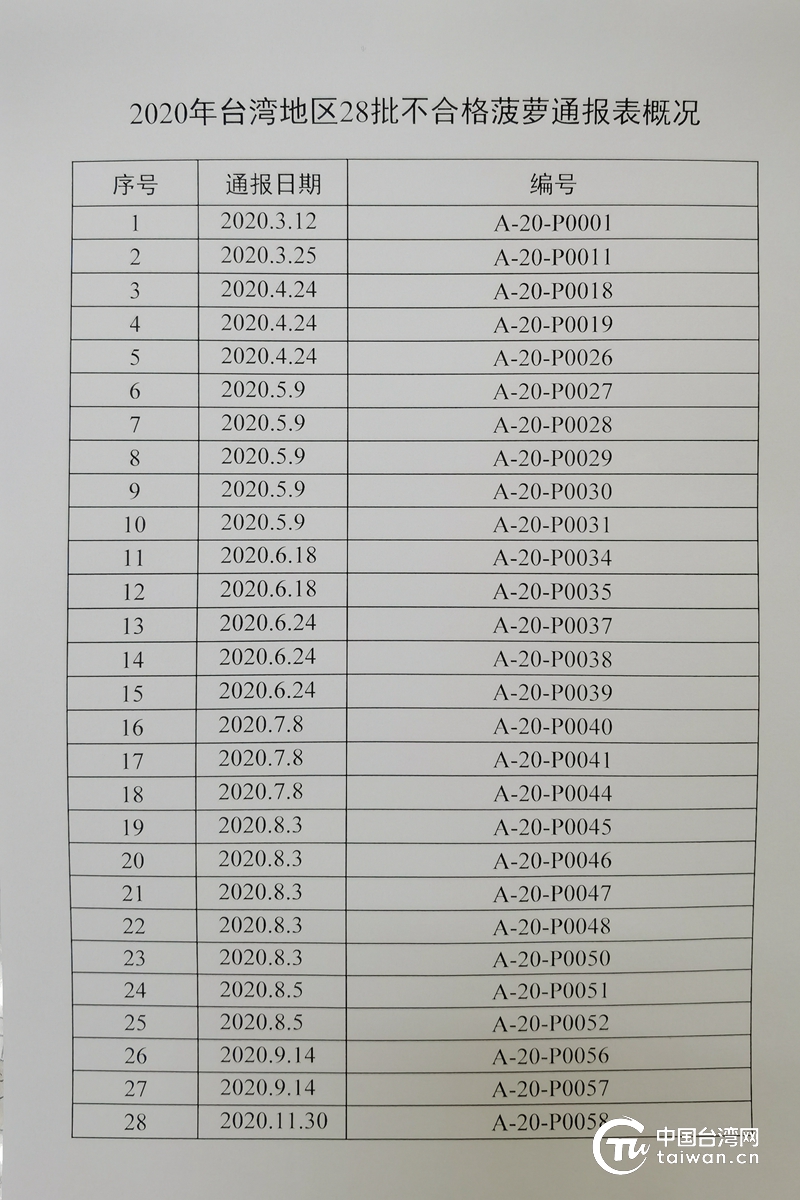 2020年臺灣地區(qū)28批不合格菠蘿通報表。(中國臺灣網 發(fā))