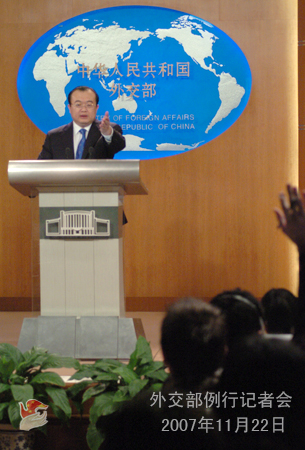 2007年11月22日,外交部發(fā)言人劉建超舉行例行記者會,就中印聯(lián)合軍事訓(xùn)練、中東問題國際會議、達(dá)爾富爾問題、氣候變化等答記者問。