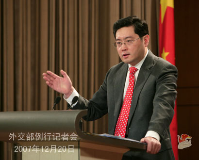 2007年12月20日下午,外交部發(fā)言人秦剛舉行例行記者會(huì),就朝鮮半島核問題、李明博當(dāng)選韓國(guó)新一屆總統(tǒng)、日本福田首相訪華、中印聯(lián)合反恐訓(xùn)練、緬甸問題等回答記者提問。