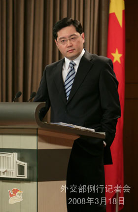 2008年3月18日下午,外交部發(fā)言人秦剛舉行例行記者會,就拉薩發(fā)生打砸搶燒嚴(yán)重暴力犯罪事件、朝鮮半島核問題等答記者問。