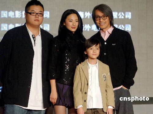 十一月二十二日,周星馳攜張雨綺(左二)、徐嬌(右二)、林子聰(左一)在北京出席其新片《長江七號》的發(fā)布會,他接受記者采訪時坦言這部電影是源自自己從小的一個夢想,并曾真的見過兩次UFO。 中新社發(fā) 廖攀 攝