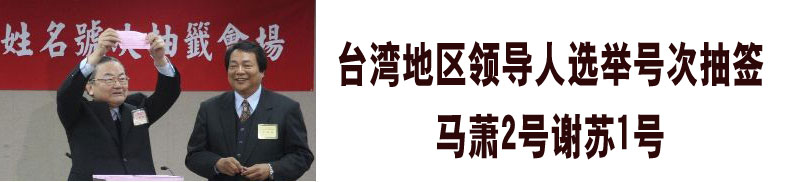 據(jù)臺灣TVBS電視臺報道,臺灣地區(qū)領(lǐng)導(dǎo)人選舉將在3月22日舉行,今天上午臺當(dāng)局“中選會”進行號次抽簽作業(yè),馬、謝本人都未親自出席,馬蕭陣營派出競選總干事詹春柏及詹啟賢代為出席,而謝蘇陣營則是派出競選總干事葉菊蘭及執(zhí)行總干事李應(yīng)元代表。