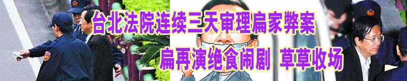 臺(tái)北地方法院26日就扁家弊案提訊陳水扁。由于律師從上午起就不斷以陳水扁身體不適為由,提出停止羈押,下午審判長(zhǎng)蔡守訓(xùn)宣布改為審理是否羈押陳水扁;羈押庭經(jīng)過(guò)兩個(gè)多小時(shí)的檢辯攻防,蔡守訓(xùn)裁定陳水扁繼續(xù)還押臺(tái)北看守所。合議庭已另定于3月4日、10日、11日、18日就陳水扁被控犯罪的部分開庭......《全文》 |