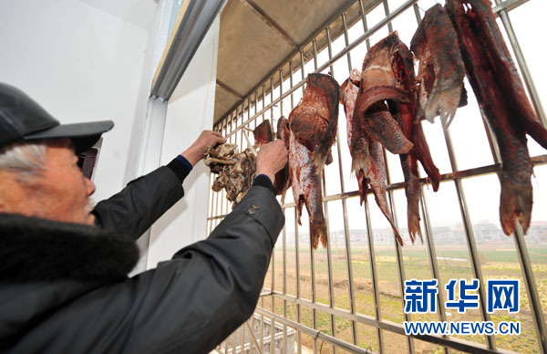 李元庭在新家的樓上晾曬為過(guò)年準(zhǔn)備的新腌制的臘肉和魚(yú)(1月22日攝)。