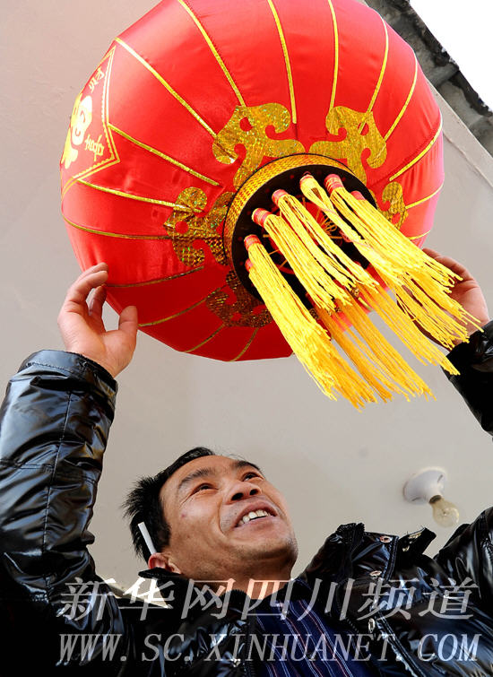 四川彭州災區(qū)群眾喜歡用燈籠營造喜慶氣氛,希望來年日子過得紅紅火火、稱心如意。據(jù)了解,作為汶川地震極重災區(qū)的四川省彭州市經過兩年多的災后重建,6.8萬戶受災群眾已經全部搬入新居。