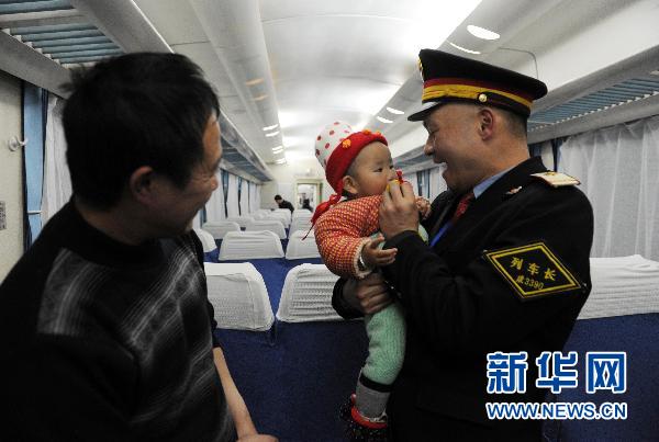 2月2日晚,列車長陶然抱起1歲2個月大的黃心怡,哄她早點入睡。農(nóng)歷大年三十,是中國人全家團聚辭舊迎新的時刻,但依然有一些人因為工作等原因,不得不在旅途中度過除夕夜。2日晚,記者踏上由成都開往貴陽的K9517次列車,在列車上與返鄉(xiāng)的106名旅客和50名工作人員一同度過了一個難忘的年三十。與春節(jié)前列車滿員的情況相比,年三十可以算是春運開始后最輕松的一天,但列車長陶然卻并不輕松。從大學畢業(yè)開始,他已經(jīng)在鐵路系統(tǒng)工作了18年,今年是他在列車上度過的第8個除夕夜。為了讓旅客們在列車上過好年,陶然和列車員們盡可能提供貼心周到的服務,并給大家送上了新年小禮物和節(jié)日的問候。陶然告訴記者:“只要列車上還有一名乘客,我們都沒有輕松的時候!丶摇沁@列火車上每個人都期盼的事情,我們要讓旅客在歸途中感受到家的氛圍”。新華社記者 陳誠 攝