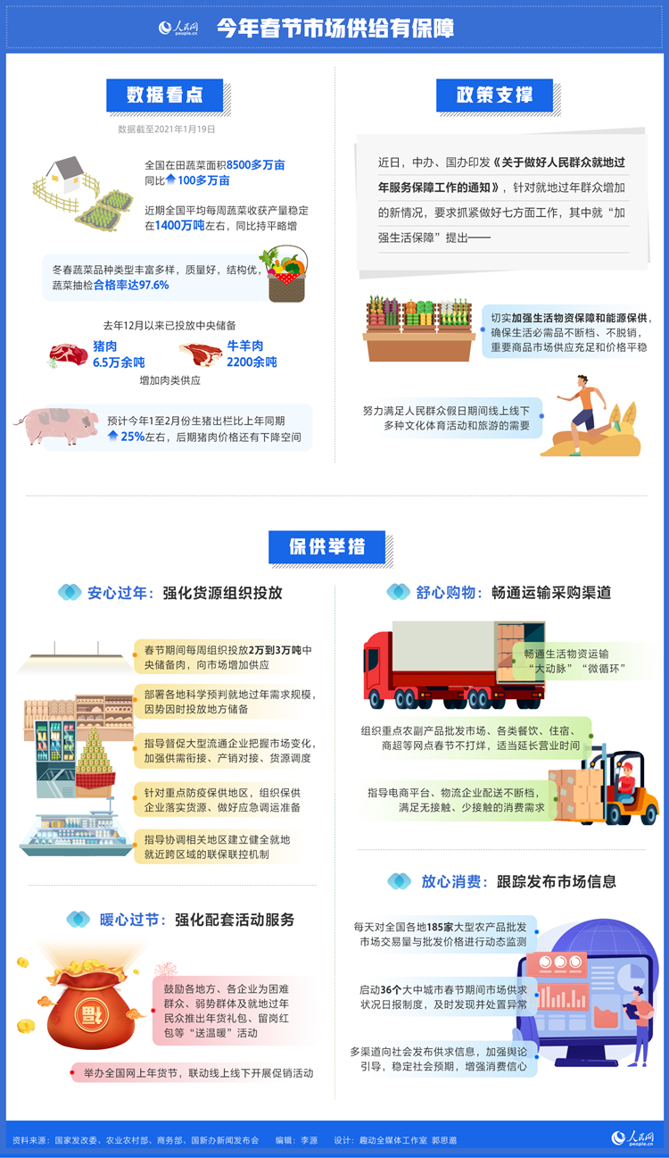 春節(jié)回家團(tuán)圓,對國人來說是習(xí)俗更是情結(jié)。不過,在當(dāng)前疫情防控形勢依然嚴(yán)峻復(fù)雜的情況下,也有越來越多的人選擇“就地過年”。大家的選擇更多樣了,需求更多元了,春節(jié)消費(fèi)市場的保供工作怎么做?“米袋子”“菜籃子”是否充裕?煤電油氣供應(yīng)如何?供貨渠道是否暢通?