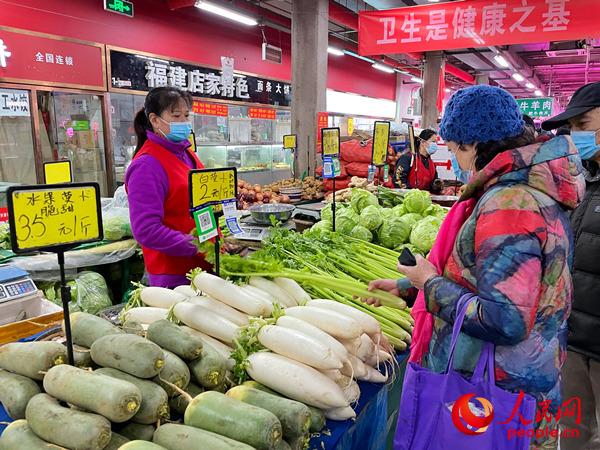 “賣啥的都有,不缺貨,物價(jià)也還可以,春節(jié)不打算專門囤菜!痹诒本┦谐枀^(qū)大黃莊便民市場,董大媽熟練地掃碼、測溫,趕早進(jìn)入市場,挑選了新鮮的白菜、蘿卜、黃瓜、草莓、橘子,花了43.6元。