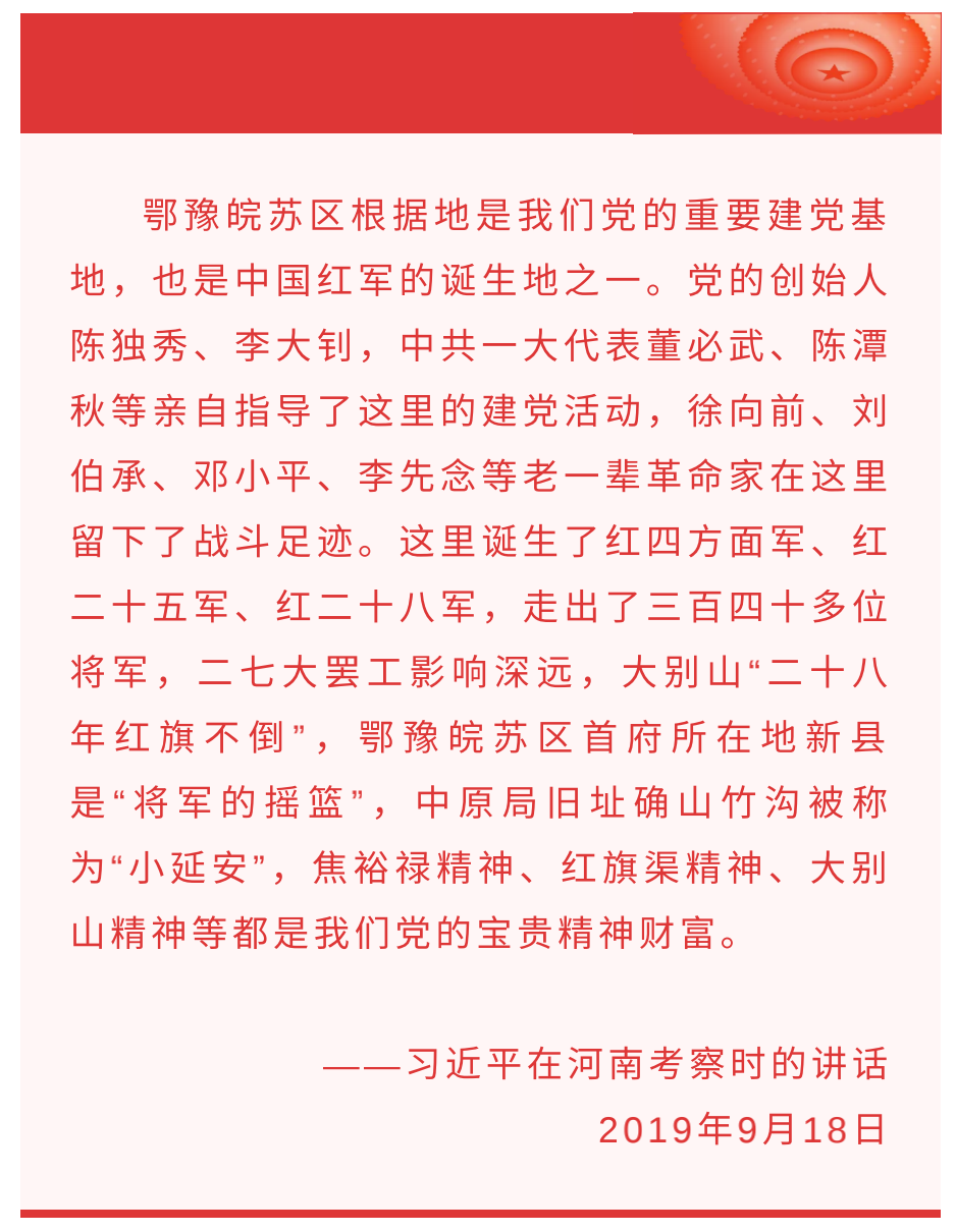 河南新縣是將軍的搖籃。土地革命時(shí)期,這里是黃麻起義的策源地、鄂豫皖革命根據(jù)地首府所在地,先后誕生了紅四方面軍等主力紅軍,走出了多位叱咤風(fēng)云的共和國(guó)將軍。