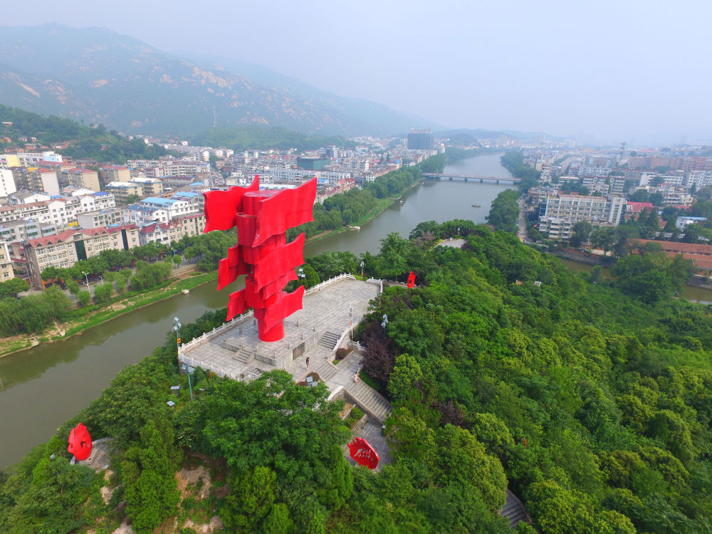 △河南省信陽(yáng)市新縣鄂豫皖蘇區(qū)首府革命博物館附近的英雄山八面紅旗雕塑(2017年8月4日攝)。新華社記者 馮大鵬 攝