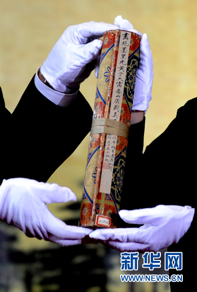 5月11日,工作人員在啟運儀式上展示《富春山居圖》(剩山圖)! ‘斎眨憬〔┪镳^的“鎮(zhèn)館之寶”《富春山居圖》前半段(剩山圖)赴臺啟運儀式隆重舉行。《富春山居圖》(剩山圖)在浙江省博物館點交啟運,將經(jīng)由北京后赴臺,于6月1日在“山水合壁——黃公望與《富春山居圖》特展”上,與臺北故宮博物院所藏《富春山居圖》(無用師卷)聯(lián)合展出。這將是該畫作兩部分在分別360年后首次實現(xiàn)合璧! ⌒氯A社發(fā)(梁臻 攝)