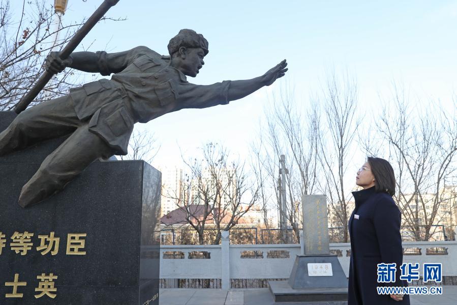 2月2日,梁士英烈士的孫女梁丹丹在梁士英舍身炸地堡遺址瞻仰爺爺?shù)裣瘛P氯A社記者 楊青 攝