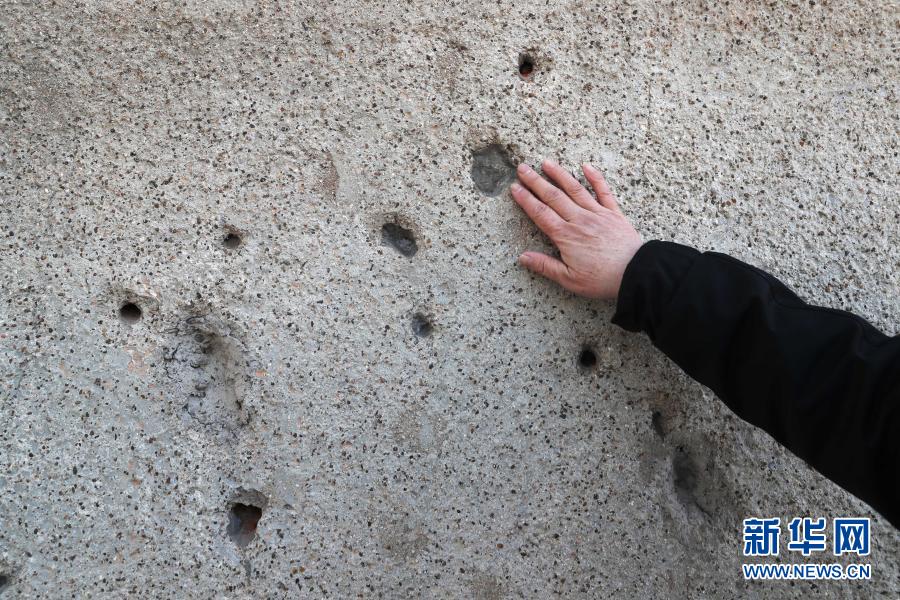 2月2日拍攝的配水池戰(zhàn)斗遺址墻體上的彈孔。新華社記者 楊青 攝