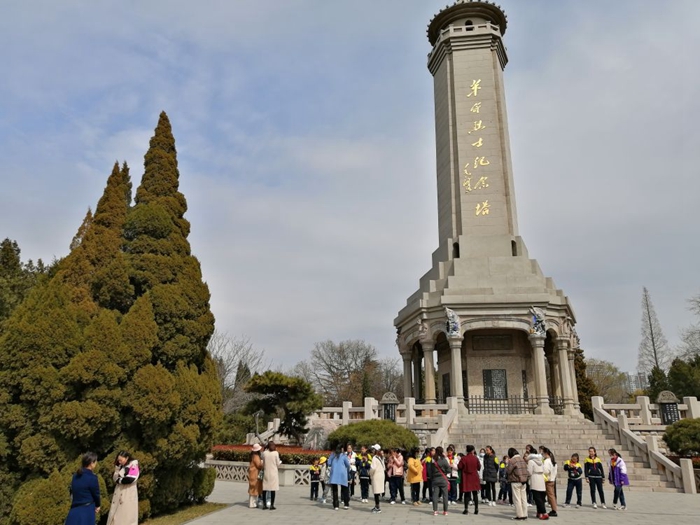 2021年3月18日,小小紅色講解員在位于烈士陵園中央的革命烈士紀(jì)念塔前,學(xué)生們?cè)趯W(xué)習(xí)講解知識(shí)的同時(shí)也接受紅色教育。新華社記者楊文 攝