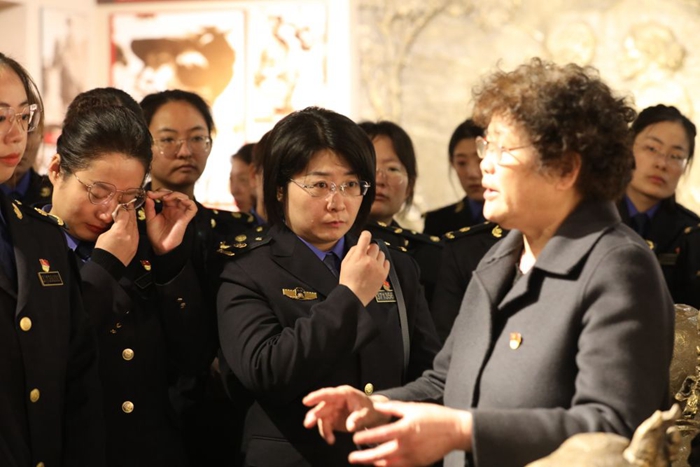 2021年3月5日,山東省臨沂市沂南縣綜合行政執(zhí)法局女黨員聆聽(tīng)于愛(ài)梅(右二)講紅嫂擁軍支前故事,很多黨員被感動(dòng)流淚。杜昱葆 攝