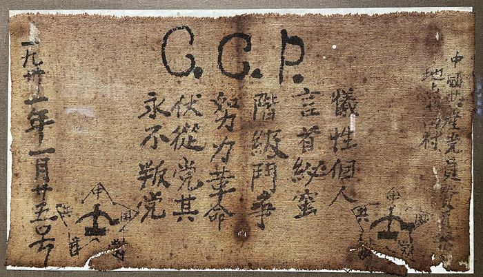1931年1月25日,在榨油坊昏暗的油燈下,他拿出一塊早已準(zhǔn)備好的紅布,在上面寫下了那段誓詞,并留下了自己的名字和入黨的時間、地點(diǎn)。