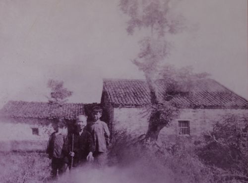 上圖為賀佐武(左一)、賀佐文與爺爺賀頁朵在榨油坊前的合影。
