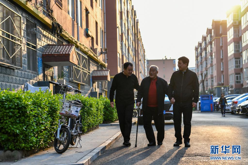 張良貴(中)、張海(左)、張世奇在散步(4月22日攝)。
