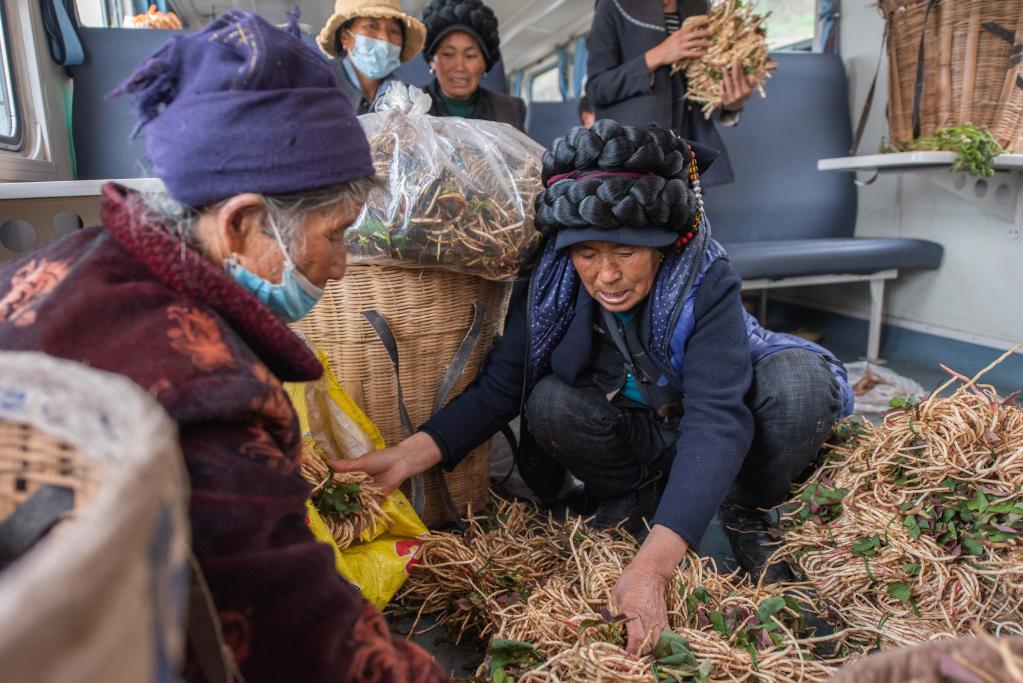 成昆鐵路5633次列車的“流動集市”上,一名彝族婦女(前右)在挑選折耳根(2021年4月11日)。新華社記者胥冰潔 攝