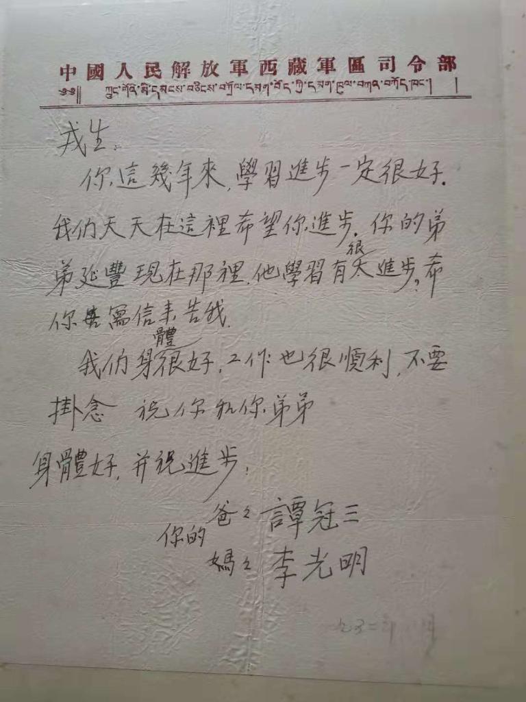 1952年8月,譚戎生11歲那年,譚冠三在西藏給他寫了第一封家書,而此時(shí)距兩人上次見面,已相隔5年之久了。