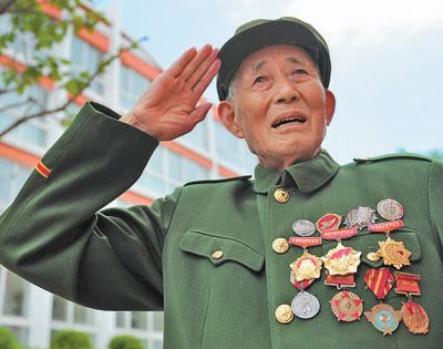 年近期頤,褶皺的臉上寫(xiě)滿歲月的痕跡,但每當(dāng)國(guó)歌和軍歌旋律響起,老人總是目含敬意,深情致以軍禮。這一刻,老戰(zhàn)士神采奕奕。