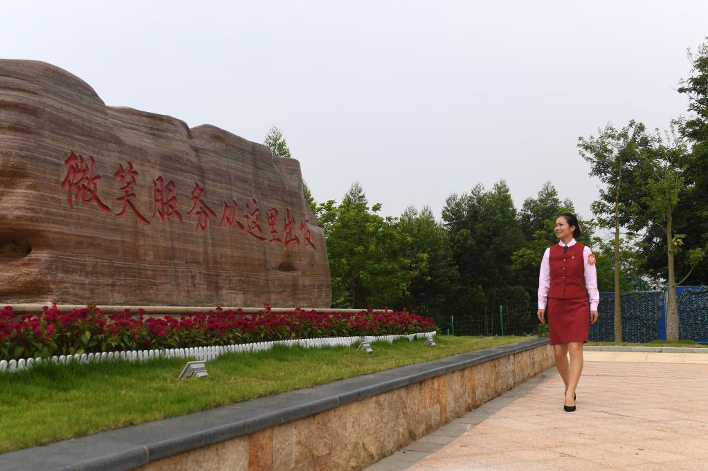 在廣西交通投資集團(tuán)南寧高速公路運(yùn)營(yíng)有限公司南寧東收費(fèi)站,農(nóng)鳳娟從辦公樓外一塊刻有“微笑服務(wù)從這里出發(fā)”的巨石前走過(guò)(8月6日攝)。新華社記者陸波岸攝