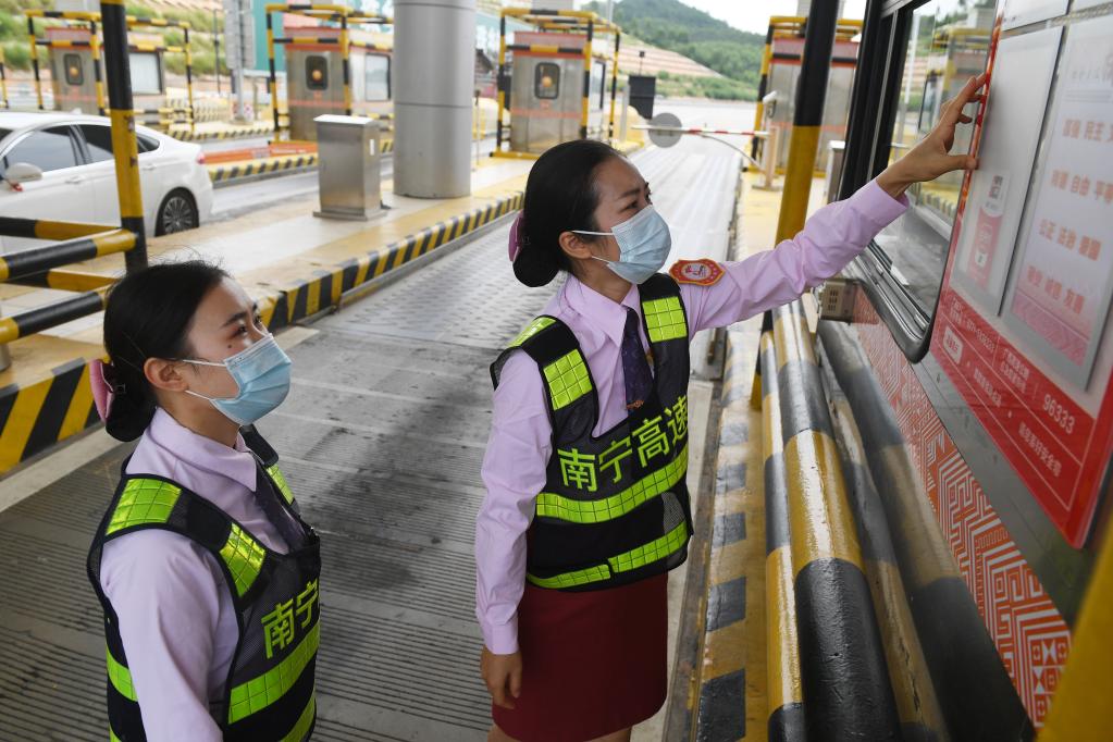 在廣西交通投資集團(tuán)南寧高速公路運(yùn)營(yíng)有限公司南寧東收費(fèi)站,農(nóng)鳳娟(右)在檢查有關(guān)服務(wù)提示張貼情況(8月6日攝)。新華社記者陸波岸攝