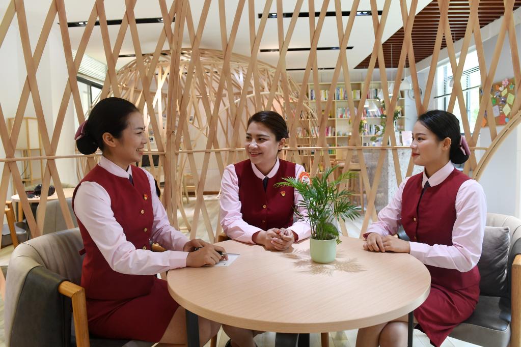 在廣西交通投資集團(tuán)南寧高速公路運(yùn)營(yíng)有限公司南寧東收費(fèi)站職工書(shū)屋,農(nóng)鳳娟(左一)在和同事談心(8月5日攝)。新華社記者陸波岸攝