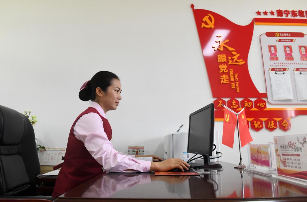 在廣西交通投資集團(tuán)南寧高速公路運(yùn)營(yíng)有限公司南寧東收費(fèi)站辦公室,農(nóng)鳳娟正在辦公(8月6日攝)。新華社記者陸波岸攝