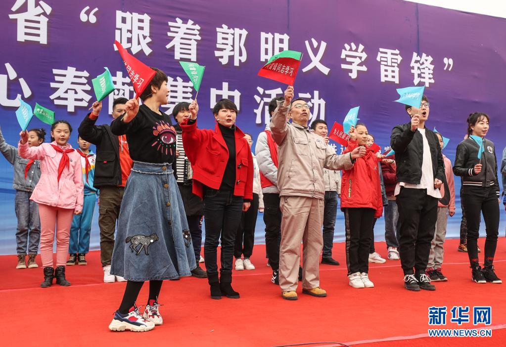 2019年3月5日,在遼寧省葫蘆島市文化廣場舉行的遼寧省“跟著郭明義學(xué)雷鋒”愛心奉獻(xiàn)集中活動現(xiàn)場,郭明義(前排中)與志愿者合唱《學(xué)習(xí)雷鋒好榜樣》歌曲。新華社記者 潘昱龍 攝